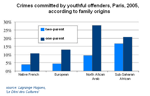 Hugues Lagrange found that in the same socioeconomic class, "teens brought up in families from Sub-Saharan Africa commit crimes at three to four times the rate of native French teens."