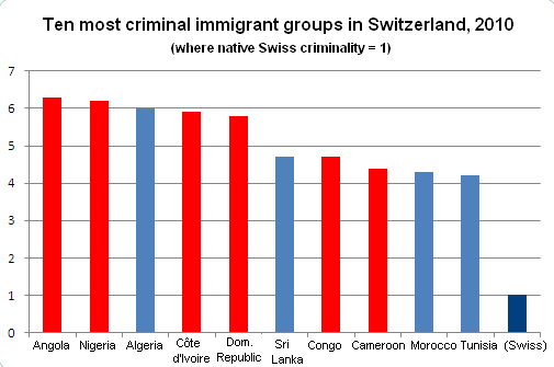 In 2010 for the first time was a statistic published which listed delinquency by nationality (based on 2009 data). To avoid distortions due to demographic structure, only the male population aged between 18 and 34 was considered for each group.