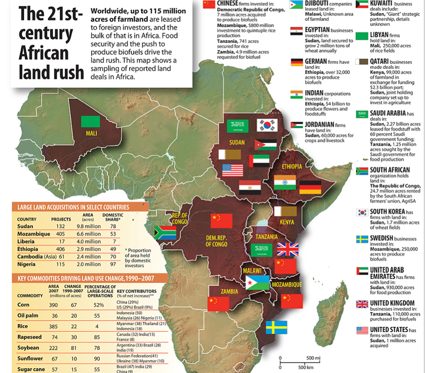 One-third of the Gambela area in western Ethiopia is being leased for the next 50 years by the Bangalore food company Karuturi Global. Forests are being clear-cut, swamps drained, rivers diverted and whole villages moved to make way for flower farms and palm-oil and rice plantations.Half of the Democratic Republic of the Congo's agricultural lands are being leased to grow crops, including palm oil for the production of biofuels. Perhaps the largest single venture to date is the ProSAVANA Project in northern Mozambique, where an area roughly the size of Switzerland and Austria combined has been leased by Brazilian and Japanese companies to produce soybeans and maize for export.