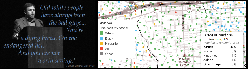 Besides David Brooks up there singing the praise of 26% white Houston from his 85% white D.C. bubble, there's also 'White Like Me' Tim Wise, who claims to hate 'whites like him' but lives in a 97% white neighborhood. Also Michael Moore, who left his hometown Flint after it shot down to 35% white, off to the greener pastures of 93% white Traverse City (black population 0.7%... yes, that's seven-tenths of one percent). Seems 'Stupid White Men' don't make such bad neighbors after all...